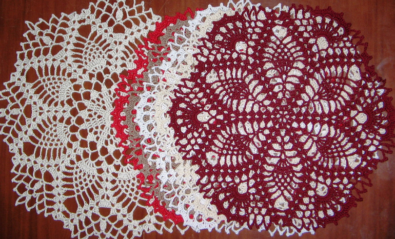 Продам одиннадцать круглых салфеток связанные крючком 1.1 из ниток фирмы Вита под названием Пеликан. 100 % хлопок. 26 см в диаметре. Одна салфетка белая, три - цвета слоновой кости, три - красных, одна - цвета темной вишни, одна - светло - коричневая одного рисунка. Две салфетки цвета слоновой кости другого рисунка. Одна салфетка весит 16 грамм. общая стоимость 2200 руб. плюс почтовые расходы.