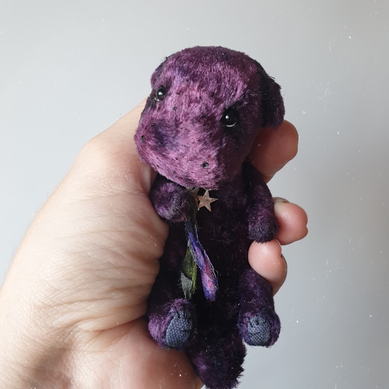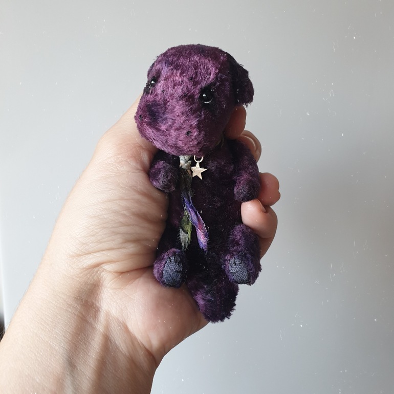 Сшит из советского плюша ручного окрашивания, внутри опилки, голова и лапы подвижные, рост ~10см
