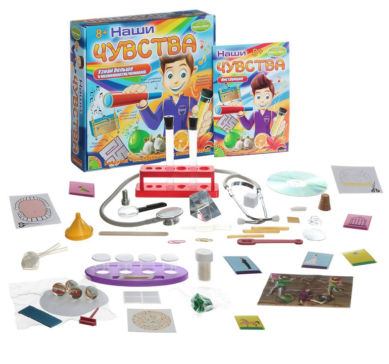 Опыты, эксперименты и исследования - это то, что любят все дети! В увлекательной форме, можно изучить все пять человеческих чувств. Чувства, которыми мы пользуемся каждую минуту. Полученные, таким образом знания, усвоятся и будут применимы в повседневной жизни ребенка. С помощью набора ребенок сможет узнать много нового о возможностях человеческого организма, познакомится с устройством органов зрения, слуха, обоняния, осязания и вкуса. Используя набор, дети смогут понять, каким образом мы ощущаем, видим и слышим, и провести большое количество опытов, наглядно иллюстрирующих чувства человека.