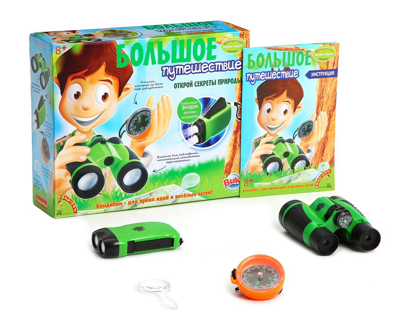 Цель "большого путешествия" в игровой форме изучить флору и фауну! В наборе есть все, что нужно для похода, бинокль, фонарик, увеличительное стекло и компас. Ваш ребенок научится ориентироваться на местности, наблюдать за животными, откроет для себя мир деревьев и растений.