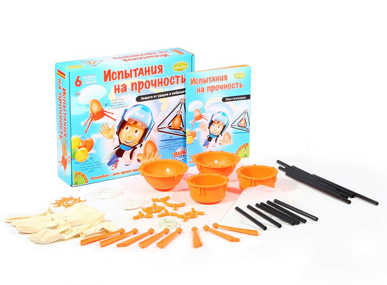 Опыты, эксперименты и исследования - это то, что любят все дети! В увлекательной форме, можно изучить секреты физики и каким образом сделать защитную конструкцию. Полученные, таким образом знания, усвоятся и будут применимы в повседневной жизни ребенка. Можно устроить падение яйца с парашютом или построить прыгающую защитную конструкцию! Все в твоих руках! С набором "Испытание на прочность" ваш ребенок станет настоящим инженером!