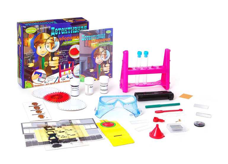 Опыты, эксперименты и исследования - это то, что любят все дети! В наборе "Детективная лаборатория" есть все, что необходимо для увлекательного и таинственного расследования! Световой микроскоп, пробирки, шифровальный диск, компас, картотека лиц, карточка отпечатков пальцев и многое другое приведет в восторг юного сыщика! Все тайное становится явным!