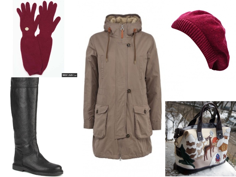 Ищу к парке головной убор/шарф и сумку. Посоветуйте, пожалуйста, какого цвета то и другое лучше приобрести с учетом имеющейся обуви? Или м.б. все это вообще не подходит, и с курткой такого цвета максимально выгодно будут сочетаться какие-то другие цвета? А какие?