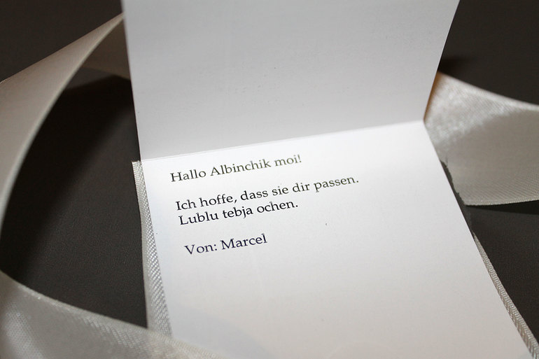 В записке: "Привет Альбинчик мой! Я надеюсь, что они тебе подойдут. Люблю тебя очень." Ну последнюю фразу думаю вы и так поймёте, немецкие буквы, русский язык. Учит русский потихоньку, по работе иногда нужно. Вот как его не любить?!? Обожаю. И не жалею, что балую его иногда, мне всё возвращается. Его подарок (http://www.babyblog.ru/user/Alichka/3123491)от меня.