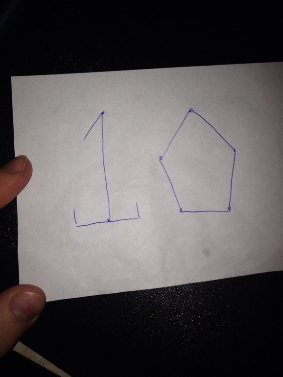 Дано: (творческое задание) "придумать цифру десять(правило знают только дети)..... Усё!!! Далее, выясняю у других мам: надо нарисовать цифру 10 с десятью углами... Оке, исполним....(ничо, что сама фраза "цифра десять" уже напрягает.....число - да, но цифра.....)
