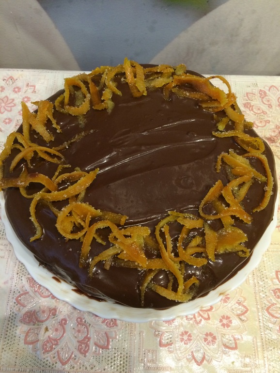 Бисквит с заварным кремом с апельсинами, шоколадной глазурью и цукатами)