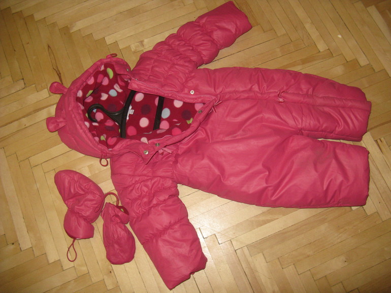 Очень теплый, пухлый такой. Обычный, без мембран и т.п. На флисовой подкладке. Размер указан 80-12 мес. Мы носили до роста 88. К комбезу прилагаются сапожки и варежки, я их куда-то убрала, т.к. мы вообще их не надевали. Пока нашла только по одному))) Так что если не найду - без них отдам((