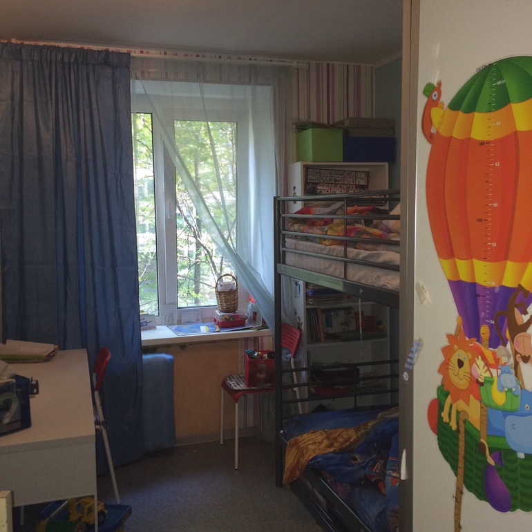 Комната совсем маленькая 8 кв м. двухярусная кровать, платяной шкаф, стеллаж и стол.