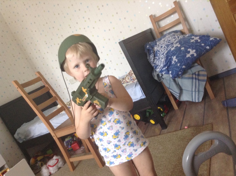 Детки многодетных семейВсе-таки, когда маленькая девочка растет со старшими братьями получается такое, что не придумаешь нарочно. Средний сын помешан на военной тематике, самолеты, вертолеты, и главное - ТАНКИ. Танков много не бывает. Периодически начинает канючить купить ему очередной танк - далее следуют характеристики. Дочка в 3,5 года подошла, обняла меня и проникновенно спросила: мама, а ты мне купишь розовый танк? Я уточнила: со стразиками? Потом она просила розовый пистолет. А вчера, она нарисовала 2 зеленых танка и один розовый, и сказала, что это - принцесса...
