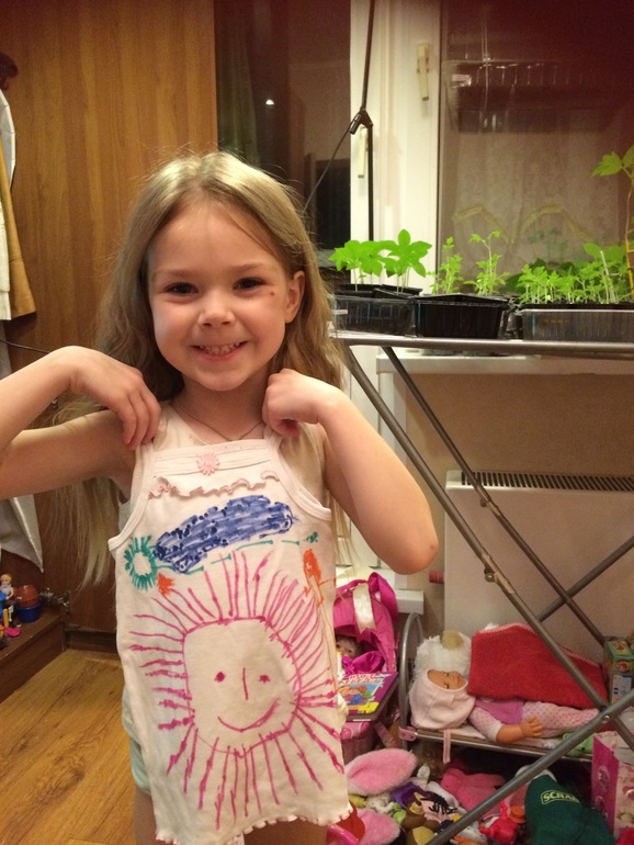 Детки многодетных семейНам сегодня подарили фломастеры по ткани!! Такие они прикольные) у дочки столько радости было изрисовать свою майку!! Нарисовала аж три солнца и девочку)) на очереди еще футболка, а фломастеры я пожалуй пока спрячу)))