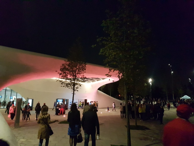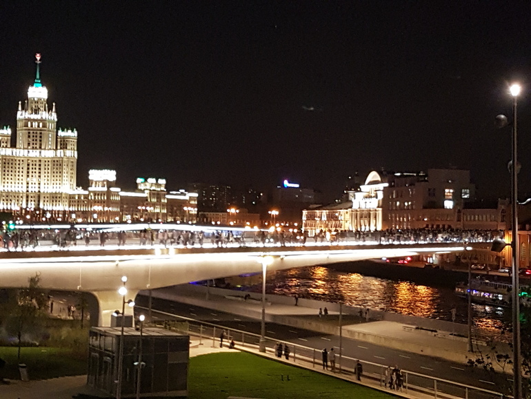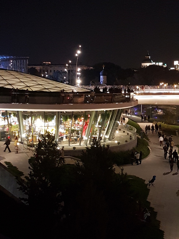 В этот день парк работал только для приглашенных. У входа встречали экскурсоводы, но группы набирались такие большие, что мы решили обойтись без них. В парке все было абсолютно бесплатно. Вода, мороженное. Конечно за мороженным стояли длиннющие очереди, мы решили, что лучше после зайдем в ГУМ и спокойно купим) В парке есть небольшая детская площадка, больше рассчитана на подросших детей. Может и для малышей есть, но мы не обошли все, в 21:00 парк закрывался. Потрясающие виды с обзорного моста. На территории есть подземный музей и ледяная пещера. Так что мы обязательно вернемся)