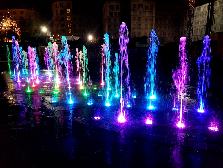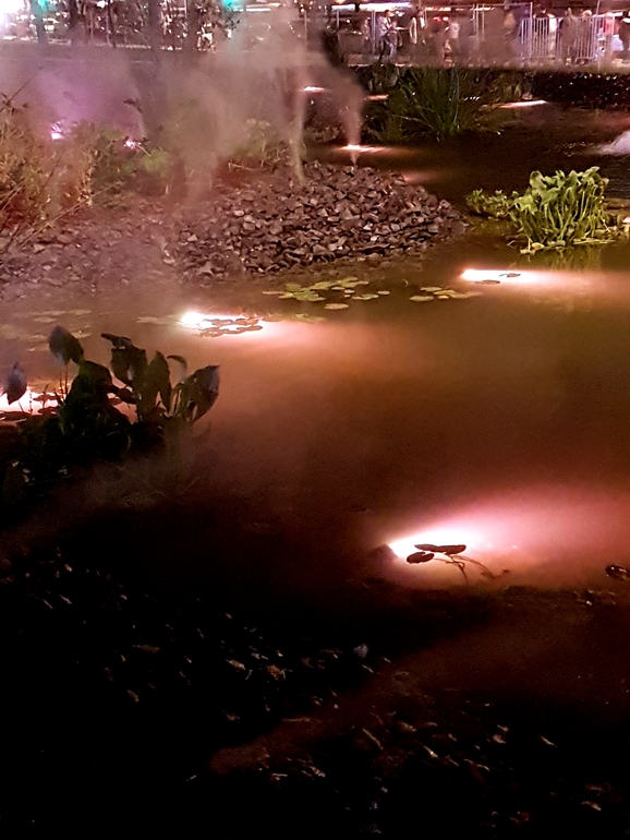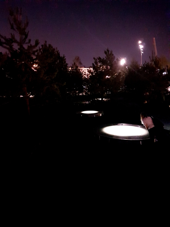 По пути к мосту наше внимание привлекли светящиеся круги, точнее светились не все, и я подумала, что просто еще не все доработано. Но ошиблась. Люди фотографировались на этих кругах, заглядывали через стекло. Мы подошли поближе