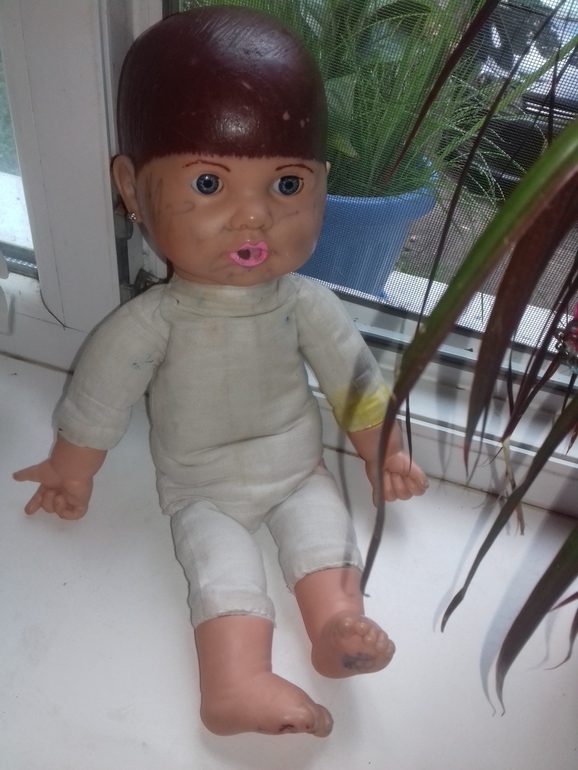 Вот, знакомьтесь, это наша Дианочка, которая была подарена дочери на 2 годика. Сейчас дочке уже 9. В куклы она уже не играет, отдать кому-то такую ..красавицу.. стыдно, выкинуть ..жалко.. - вот она и украшает комнату дочки. Рот забит пластилином, волосы пришлось покрасить акриловой краской для улучшения вида еще три года назад, тело было сшито новое около двух лет назад.