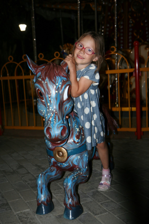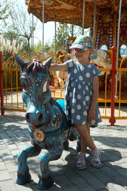 У самого входа аттракцион с бамперными машинками. Лесю и Лянку туда не пускают. Мы идем срочно искать развлечения для маленьких. У этой карусели мы оператора так и е дождались, зато немного пообщались с фотогеничным Коньком-горбунком.