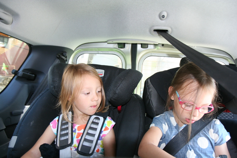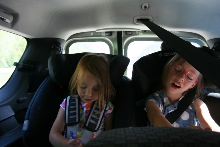 Еще у нас в машине есть пакет с несколькими любимыми мягкими игрушками, что выбрали себе девочки, немного кукольной посуды, ежик-тянучка, прилипалы на окна (такие в какой-то период в Дикси к чеку давали, а у нас они появились еще раньше, наверное года три назад). Главное, вы же знаете правило, игрушки и развлекалки надо выдавать порциями. Вот играют они во что-то одно - и пусть играют. Но если чувствуете напряжение, если вдруг кто-то готов начать ныть или даже вопить, не тяните! Доставайте из широких штанин из бардачка что-то новое и невероятное! Дети тогда сразу восхитятся "вау!", схватят, раздраконят, а вы можете дальше дремать или смотреть в окно.