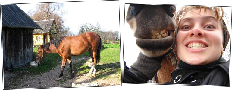 Главный аттракцион тут, конечно же, лошади. Не измученные манежной ездой, не потерявшие живости характера под ежедневным принуждением, вполне свободно носящиеся в свободное время по полям. Они легко покатают вас - правда, не без фокусов: к примеру, Муня может страдальчески-укоризненно посмотреть на вас через плечо "тяжело, братец!" и просто лечь на дороге. Смешно? А сладить надо уметь. Точнее - просто подружиться. Кстати, с ними дружить - все равно что с человеком. Живые... :-)