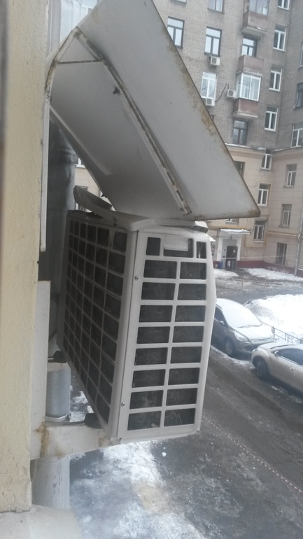 У нас висит кондей, с крышей. Сегодня сбивали сосульки с крыши, и одна глыба сломала крышу-козырёк и сплющила кондей!!!