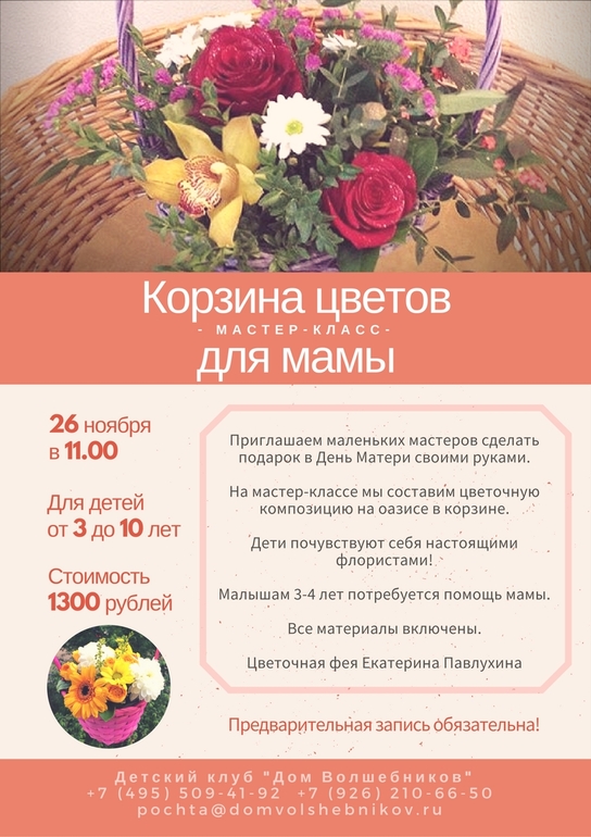 26 ноября в сети детских клубов «Дом Волшебников» пройдут творческие мастер-классы «Корзина цветов для мамы». 🌹