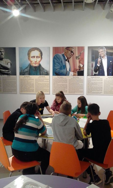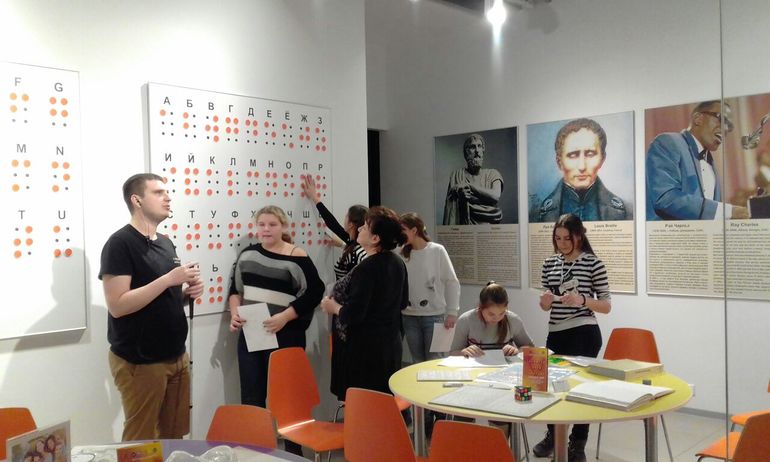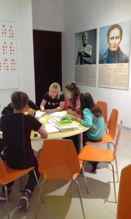 Завершается экскурсия уже в комнате со светом. В ней можно посмотреть на то, что помогает незрячим людям в быту. Ребятам понравилось печатать азбукой Брайля. А еще ребят впечатлили плакаты с биографиями известных людей, которые тоже были незрячими.