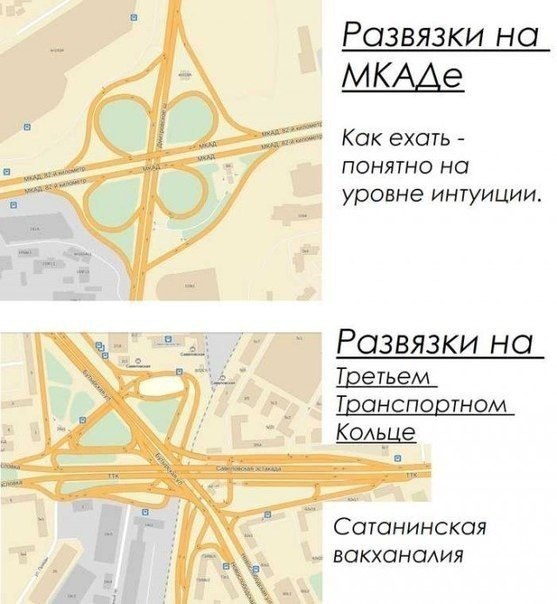 Первая развязка уже не работает в 90% случаев. А второй действительно сложный, но как впихнуть невпихуемое и соединить не соединяемое, да так, чтобы оно ехало? Позавчера каталась в районе трешки, без стальных нервов и адской интуиции не проедешь)