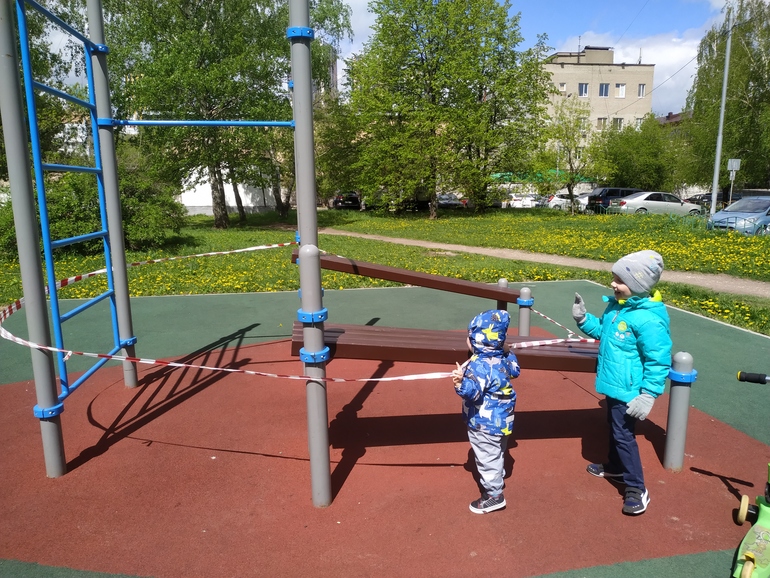 РазноеУтром все наши площадки заново старательно были перемотаны пожарной лентой. Так как вчера народ активно выгуливал детей на качелях)