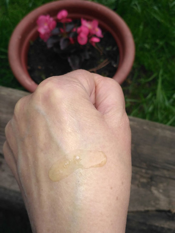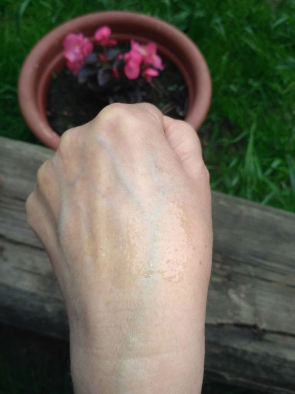 По внешнему виду на руке, масло средней жидкости не липкое, после нанесения, ощущается на теле, но не раздражает, наносила на живот, грудь и руки, это у меня проблемные места, минут через 10 полностью впитывается, кожа становится гладкой особенно на животе, приятное ощущение эластичной не сухой кожи. Жирных следов на одежде не оставляет.