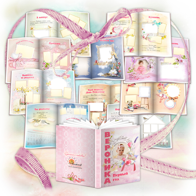 Фотокнига "Первый год" для девочки! Рождение, выписка из роддома, купание, прогулки, «семейное дерево», появление навыков и умений, рост, вес, памятные подробности развития, - и это далеко не все!