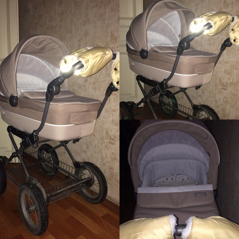 У коляски очень мягкий ход, шикарная амортизация и большие надувные колёса, она очень проходимая по снегу и не трясётся на кочках и брусчатке. Есть большая и вместительная сумка для мамы, сетка для продуктов, которая легко снимается и одевается обратно. Есть тёплый флисовый конверт для малыша. Мы им вообще не пользовались, как-то сразу перешли в тёплый комбез, непромокаемая пелёнка.