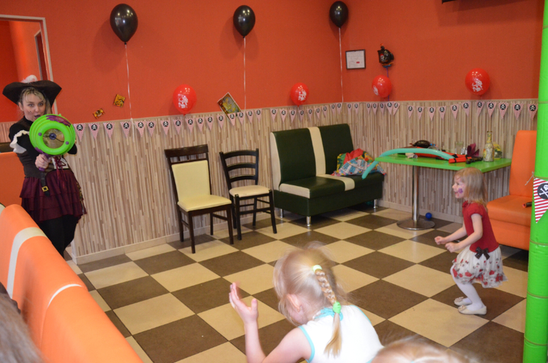 Отмечали в пицерии. Декорировали зал шарами с пиратской символикой. И своими руками делали длинные длинные растяжки. Смотрелось очень стильно!