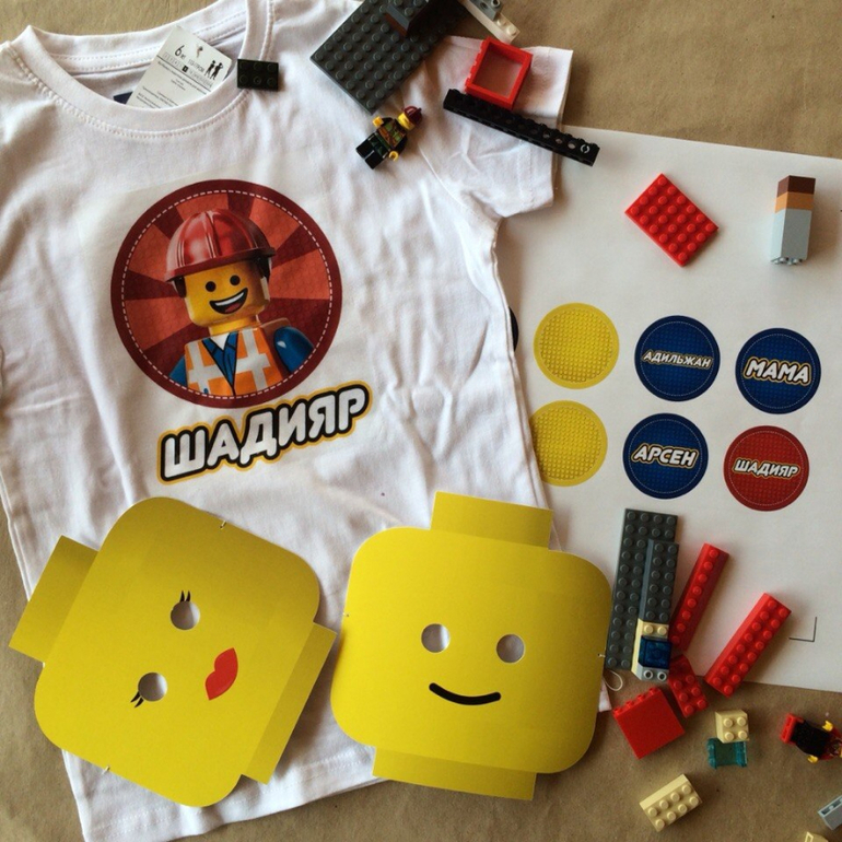 Для семилетия Шадияра мы приготовили именные футболки всем гостям, маски на резиночках для мальчиков и девочек, и именные наклейки: