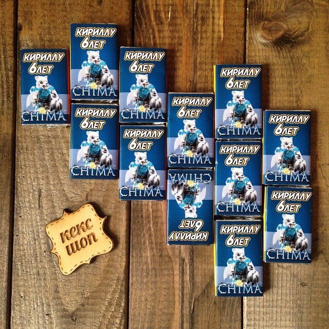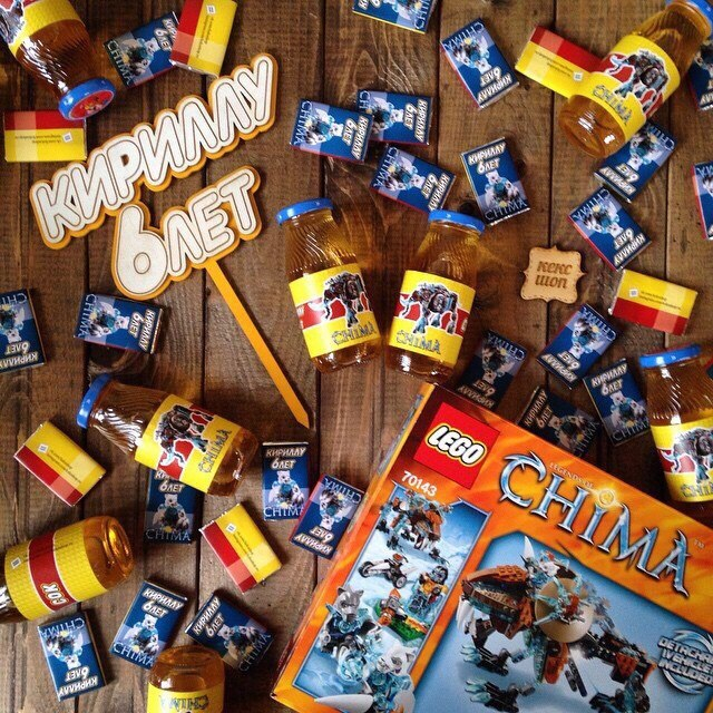 Шестилетие Кирилла мы готовили в стиле Lego Chima, деревянный топпер в торт, соки и шоколадки для угощения одногруппников в детском саду: