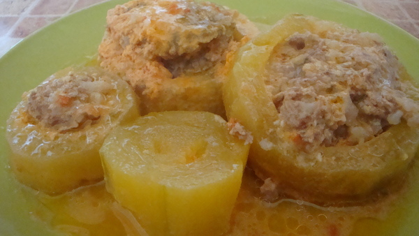 Собственно говоря ничего нового. Делала все как обычно.Фарш, кабачок без сердцевины.