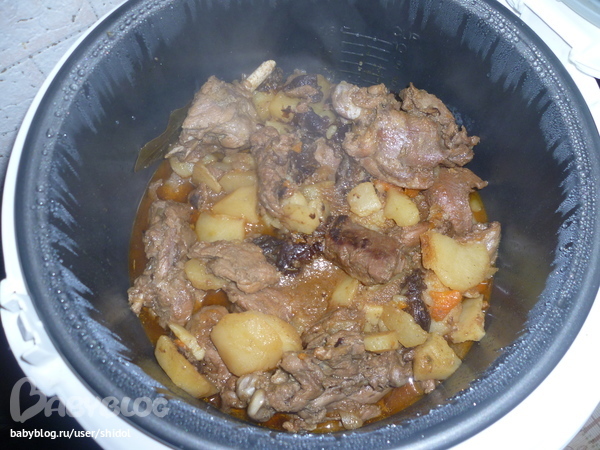 далее выкладываем в чашу картошкуи ставим на 65 минут на выпечку(помешиваем,при необходимости добавляем воду,я доливала пару мультистаканов)