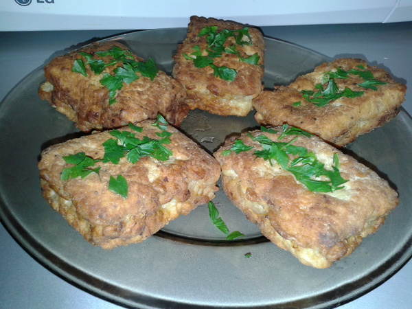 Обычные вафельные листы режем на кусочки, в серединку кладем любой фарш, формируем квадратики и обжариваем со всех сторон, предварительно обваляв в яйце и муке. МММ, ням-ням