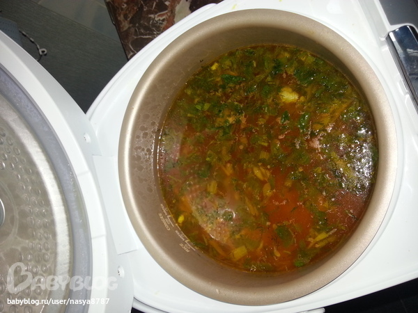 Ставите на режим жарки на 10 минут и жарите отктрытой крышкой морковку, свеклу,лук. До этого я на газу сварила говядину, бульон процедила. После того как жарка готова вливаем бульон туда капусту, картошку мясо и на режим суп. Минут через 30 попробывала все сготовилось добавила чеснока, зелени и томата. Еще минут 5 и все. Получилось беспадобно