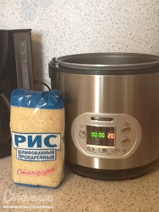 добавила рис (2 мерных стаканчика) к мульти, воды 4 стакана.