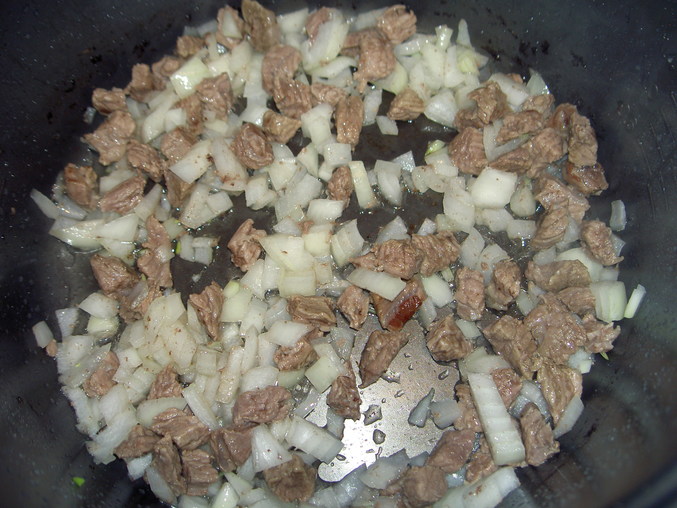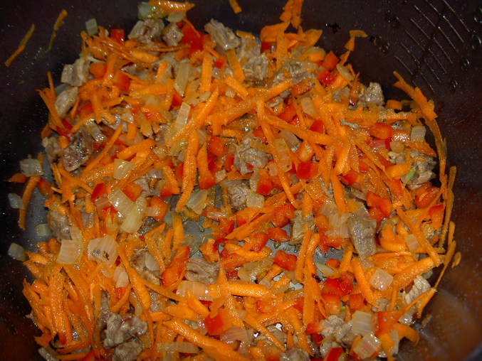Нарезать кусочками мясо (я из-за ребенка режу довольно мелко), лук кубиками, натереть морковь на средней терке, мелко нарезать болгарский перец, зелень. Мясо немного залить водой и выставить Тушение на 1 час. После сигнала воду слить, налить растительное масло по вкусу и немного обжарить на Выпечке. Затем добавить лук, немного обжарить.