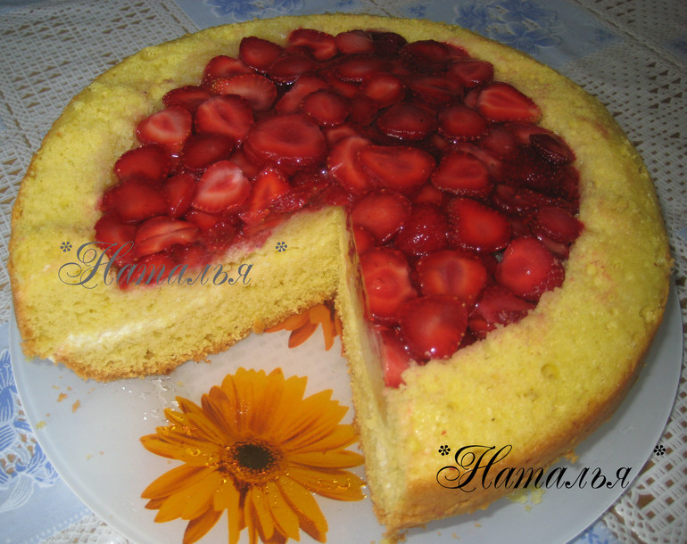 Готовый пирог разрезаем пополам, смазываем кремом и соединяем. сверху ложкой убираем часть пирога ( но не доходим до крема) заполняем "ямку" резанной клубникой и заливаем желе ( желе готовим согласно рецепту на пакетике). отправляем в холодильник на 2 часа.