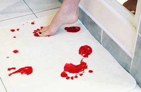 Качественный мягкий материал очень удобно и приятно использовать. Он легко чистится или стирается. Можно даже укладывать его в стиральную машинку или аккуратно чистить щеткой. В обычном состоянии ковер имеет яркий и красивый белоснежный цвет. Выглядит он весьма стандартно. Но самое необычное начинается, когда поверхность ковра соприкасается с водой. Например, когда домочадцы после душа встают на коврик голыми влажными ногами. На поверхности товара моментально начинают появляться жуткие «кровавые» следы ярко-алого цвета. Выглядит в результате изделие, как из самого настоящего фильма ужасов.