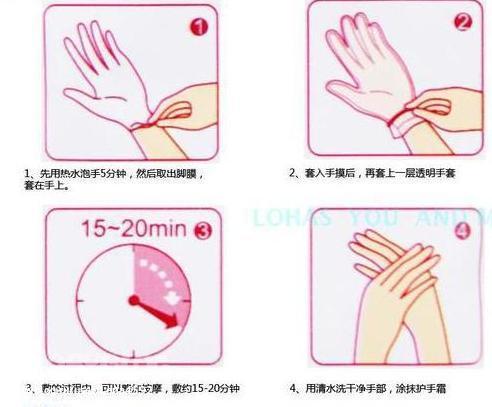 Чистые руки вымытые теплой водой, используйте перчатки которое имеют эластичность, чтобы маска плотно держалась на руках, используйте полотенце, чтобы было тепло, после 15-20 минут, снимите перчатки , вымыть руки с водой, смазать через некоторое время кремом для руки.