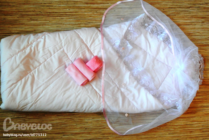 Одеяло+вуаль+3 бантика разной степени розовости с надписями. Пойдет на весну-прохладное лето. 1 слой синтепона.