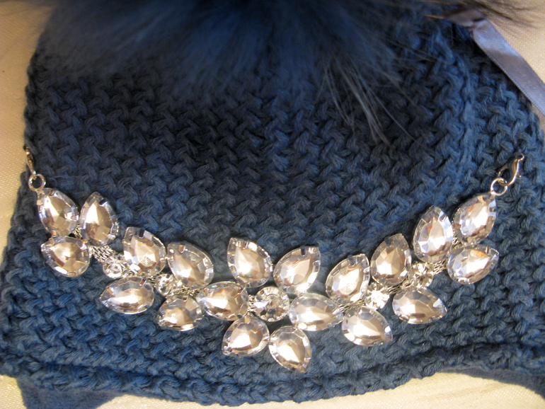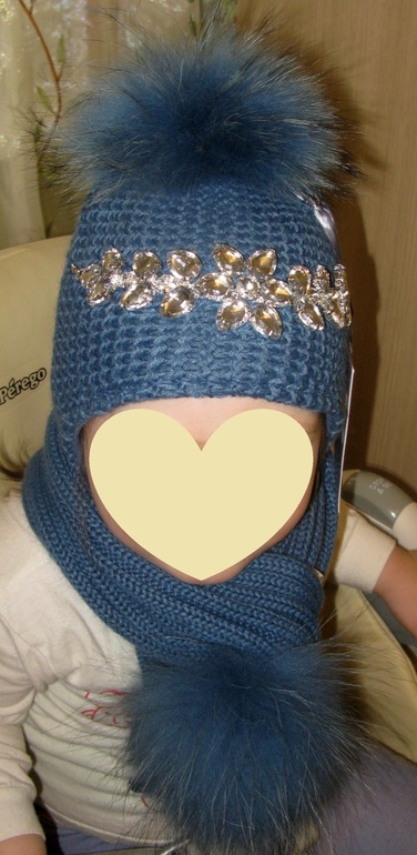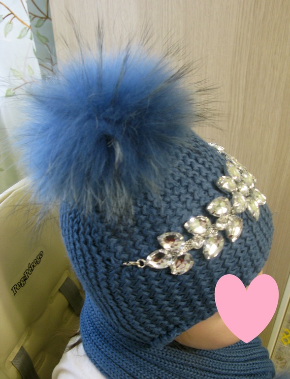 Шапка плотной вязки на завязках. Помпон из натурального меха (енот). Подкладка- флис. Украшена крупными стразами в металлической оправе. Цвет морской волны.![]()