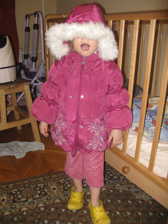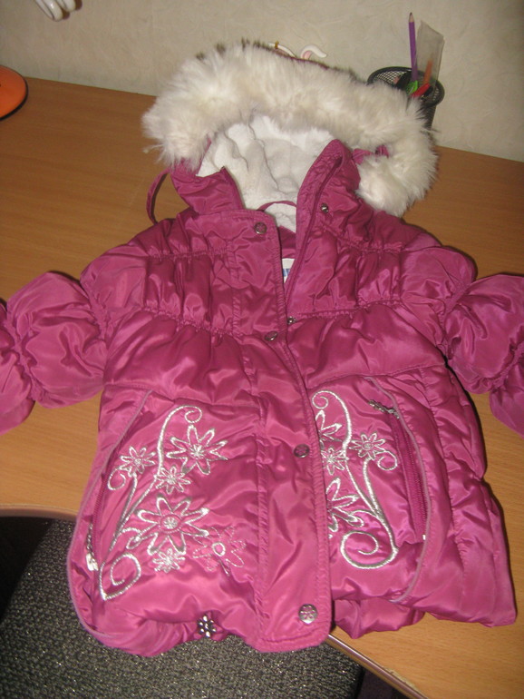 Девочка 18-24 мес(86-92 см.)Куртка на синтепоне. Очень тепленькая, красивая и удобная. Подкладка из какой-то изумительно мягкой ткани. Носили с роста 82. На фото у девочки рост 98. Ни разу не пожалела, что носим такую - теплая, уютная. Состояние на 5.