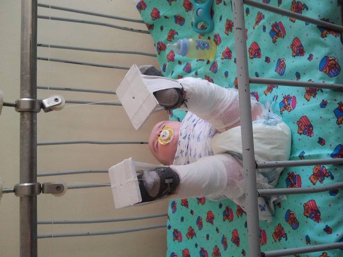 Щас мы в больнице. Лежим с малышом, Так он лежит.Ноги раздвинут на шпагат,не развязывают....Было ли такое у кого нибудь, как проходило лечение? Гипс?