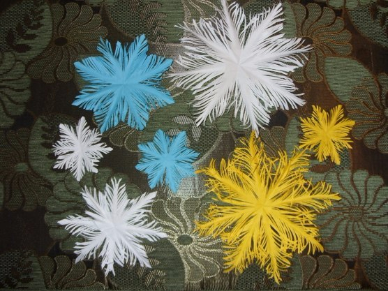 И так нарезаем несколько заготовок разного размера и разного цвета. Заготовки для снежинок лучше делать из светлых тонов бумаги.