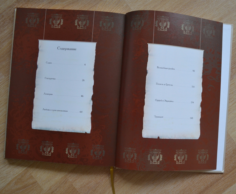 Внутри представлены либретто к известным операм в обработке Марины Дружининой: Снегурочка, Садко, Лоэнгрин, Любовь к трем апельсинам, Волшебная флейта, Гензель и Гретель, Орфей и Эвридика, Принцесса Турандот.