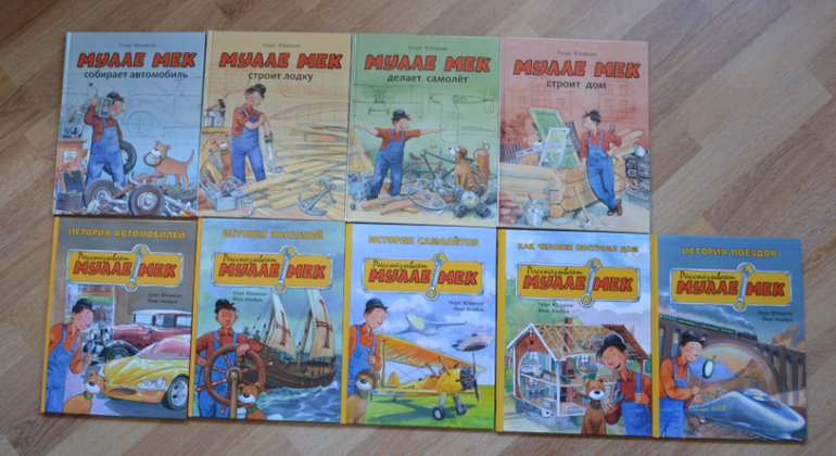 По сути это мини энциклопедии, в которых ребенку достаточно доступно рассказывается эволюция транспорта, как называются различные транспортные средства и что нас может ожидать в будущем (как изменится транспорт). В книге, о том как человек построил дом, показано как жилище человека эволюционировало от пещеры до небоскреба, а также что есть дома не только для людей, но и для поездов (депо), самолетов (ангары), автомобилей (парковки) и т.д.
