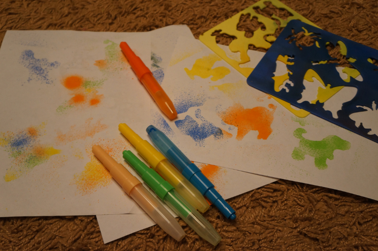 Мы использовали недорогие пластиковые трафареты. Они стоят 20-30р., разнообразные темы. Потом протираю влажной салфеткой и они как новенькие.