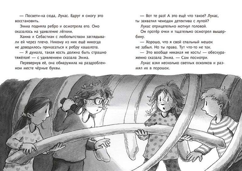 Наконец-то они оказались в Китовом музее, познакомились с многочисленными обитателями Северного моря и увидели главный экспонат - огромный скелет настоящего кашалота (кашалот, как известно, относится к подотряду зубатых китов). Но что это? Рёбра кашалота поддельные! Какие-то злоумышленники крадут драгоценную китовую кость, заменяя фрагменты скелета гипсовыми подделками. Эмма и Лукас сразу же начали расследование и быстро напали на след банды, торгующей китовой костью. Это колоритные персонажи Дылда и Карман, а также их босс Рубильник.