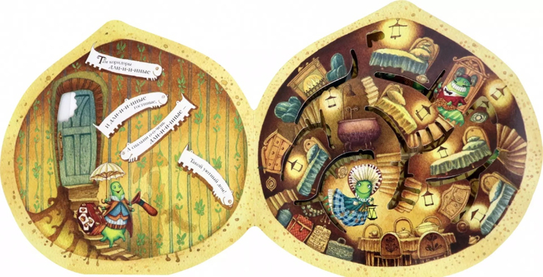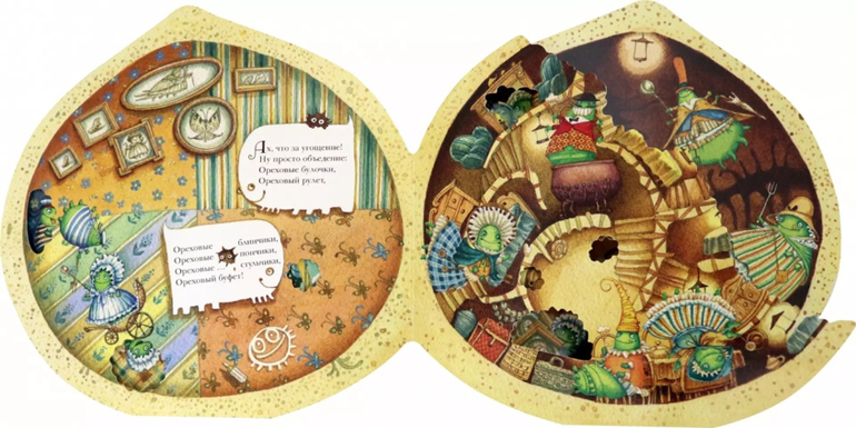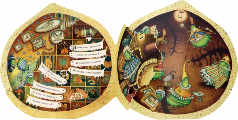 Интерактивная игровая книга в форме огромного ореха - это не просто книжка, а игрушечная гостиница "Золотой орех", придуманная Анастасией Орловой. Страницы - это комнаты и коридоры с дверцами, окошками, шкафами, кроватями, портретами на стенах и, конечно, многочисленными гостями - нарядными зелёными гусеницами. По сюжету стихотворения хозяйка гостиницы приглашает друзей на именины, орехового угощения вдоволь и гости веселятся вовсю. С каждой страницей гостиница становится всё меньше, всюду раздается радостное "хрум-хрум!", и прямо на глазах у читателей ореховые пол и потолок исчезают, а гости-гусеницы становятся всё круглее и веселее.